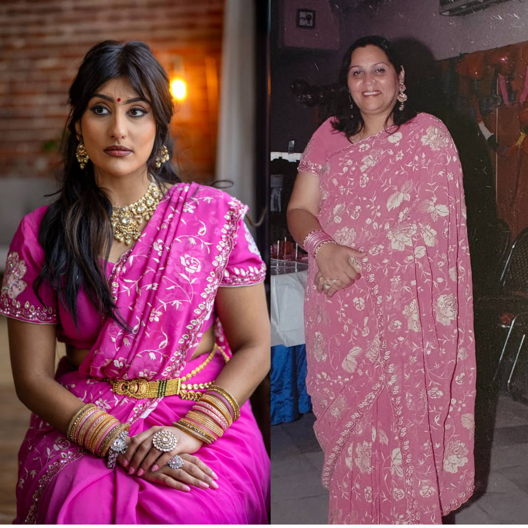Every piece I’m wearing belonged to my mother, including the sari itself from the early 2000s (pictured). Wearing her things, carrying her history, and building a visual story around that felt like an act of love.